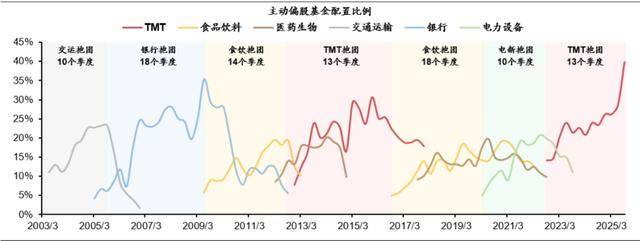 事实上,近期科技股回调更多源于交易层面扰动,而非产业趋势逆转。科技板块前期涨幅较大,获利盘集中兑现。自2024年9月24日政策底确立以来,电子、通信等TMT行业领涨。截至2025年三季度末,公募基金对TMT持仓占比已回升至约40%,且已经抱团13个季度,接近历史高位。年末临近,机构调仓,带来阶段性压力。