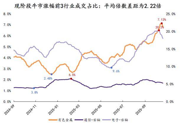 2024/9-2025/11/14涨幅前三行业成交占比:平均倍数差距为2.22倍 数据来源:华鑫证券