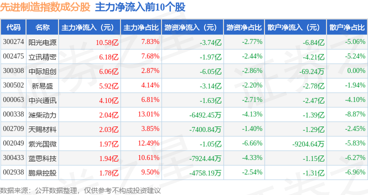 资金流向方面,先进制造(399260)指数成份股当日主力资金净流入合计41.38亿元,游资资金净流出合计15.67亿元,散户资金净流出合计25.7亿元。成份股资金流向详情见下表: