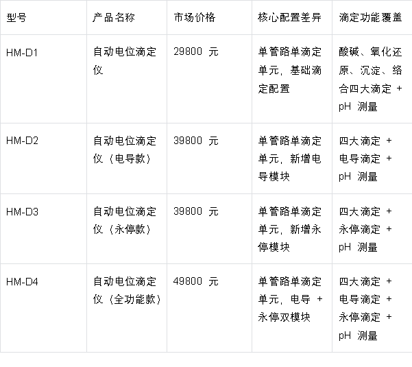总体而言,HM-D 系列电位滴定仪通过精准的型号定位、可靠的技术参数、灵活的功能扩展与亲民的价格梯度,构建了实验室滴定分析设备的完整解决方案,既满足基层实验室基础检测需求,也能适配高端科研与综合检测机构的复杂应用,为各行业质量控制与科学研究提供有力技术支撑。