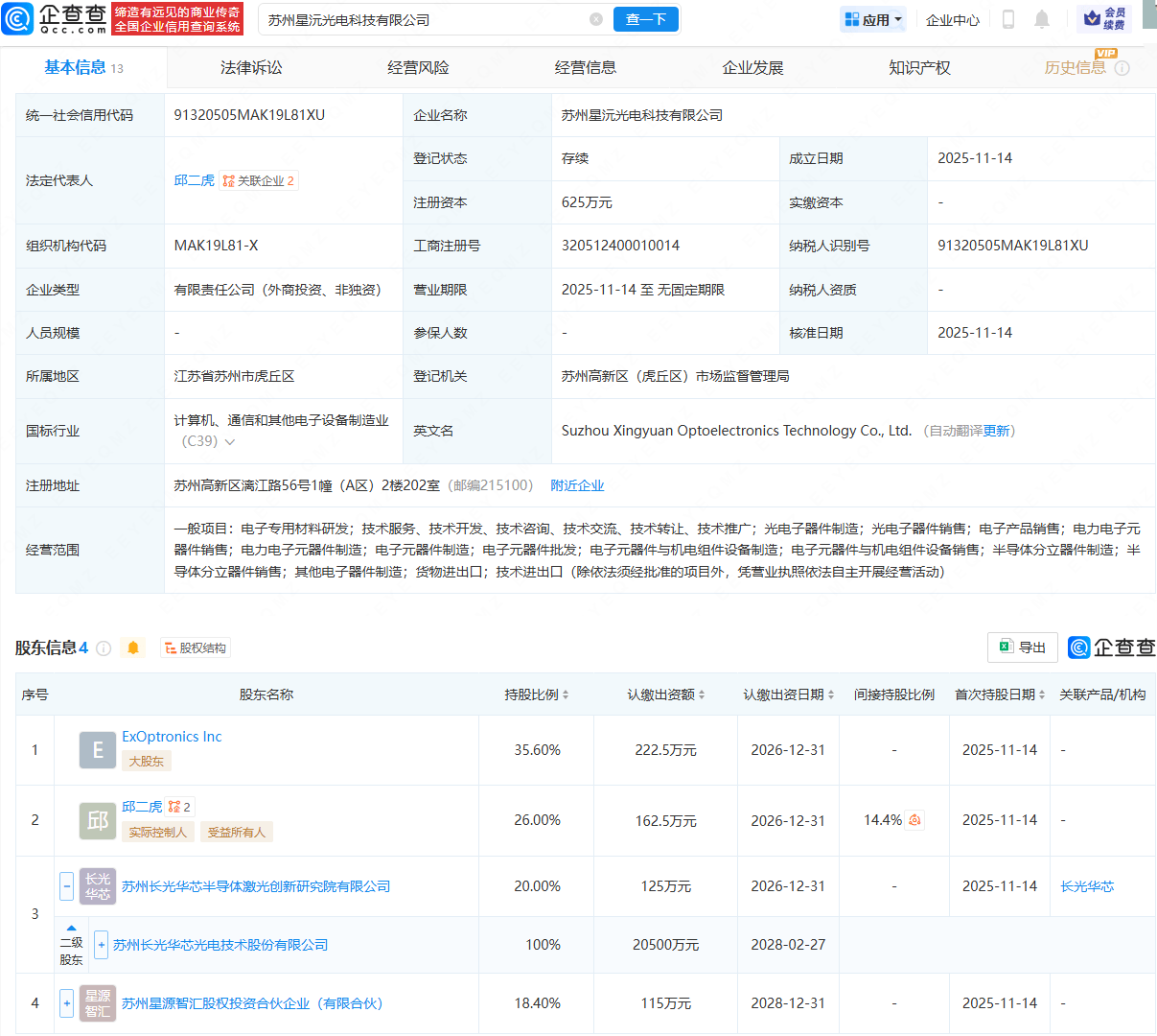 企查查APP显示,近日,苏州星沅光电科技有限公司成立,法定代表人为邱二虎,经营范围包含:电子专用材料研发;光电子器件制造;电力电子元器件销售;电子元器件制造;半导体分立器件制造等。企查查股权穿透显示,该公司由ExOptronics Inc、长光华芯(688048)全资子公司苏州长光华芯半导体激光创新研究院有限公司等共同持股。