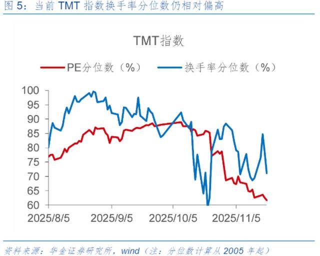 从板块的情绪和资金指标,根据华金证券数据,自8月27日调整以来(截至11/20,下同)TMT指数换手率分位数最低仅为59.2%,仍处于中性偏高位置。同时,8月27日调整以来TMT融资余额仍大幅上涨15.6%,流出幅度明显不够。说明杠杆资金仍在加仓,一旦情绪逆转,可能引发快速去杠杆。