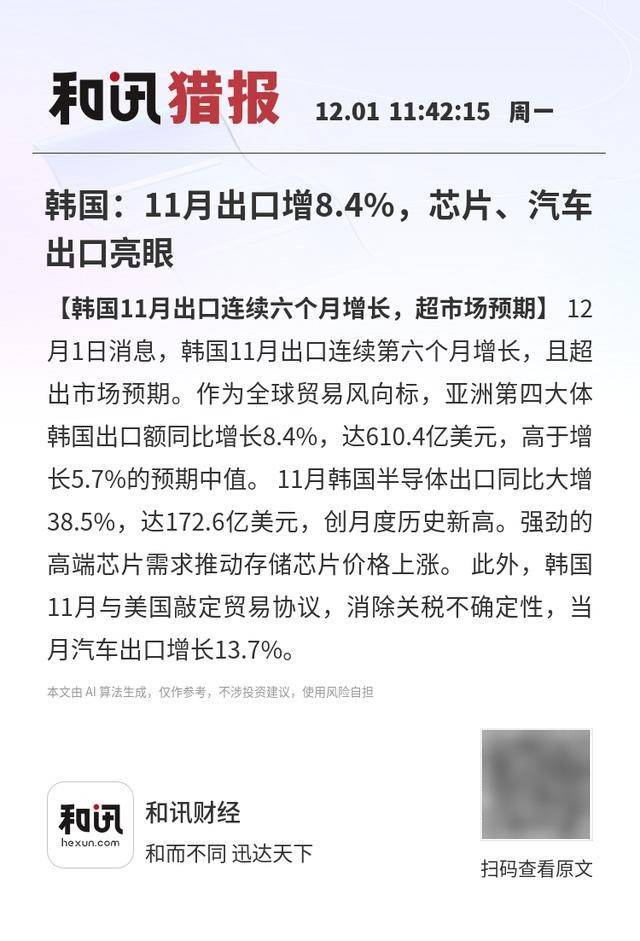 【韩国11月出口连续六个月增长,超市场预期】12月1日消息,韩国11月出口连续第六个月增长,且超出市场预期。作为全球贸易风向标,亚洲第四大体韩国出口额同比增长8.4%,达610.4亿美元,高于增长5.7%的预期中值。 11月韩国半导体出口同比大增38.5%,达172.6亿美元,创月度历史新高。强劲的高端芯片需求推动存储芯片价格上涨。 此外,韩国11月与美国敲定贸易协议,消除关税不确定性,当月汽车出口增长13.7%。