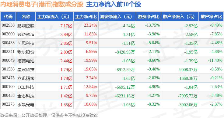资金流向方面,内地消费电子(港币)(983106)指数成份股当日主力资金净流入合计15.35亿元,游资资金净流出合计5.45亿元,散户资金净流出合计9.9亿元。成份股资金流向详情见下表: