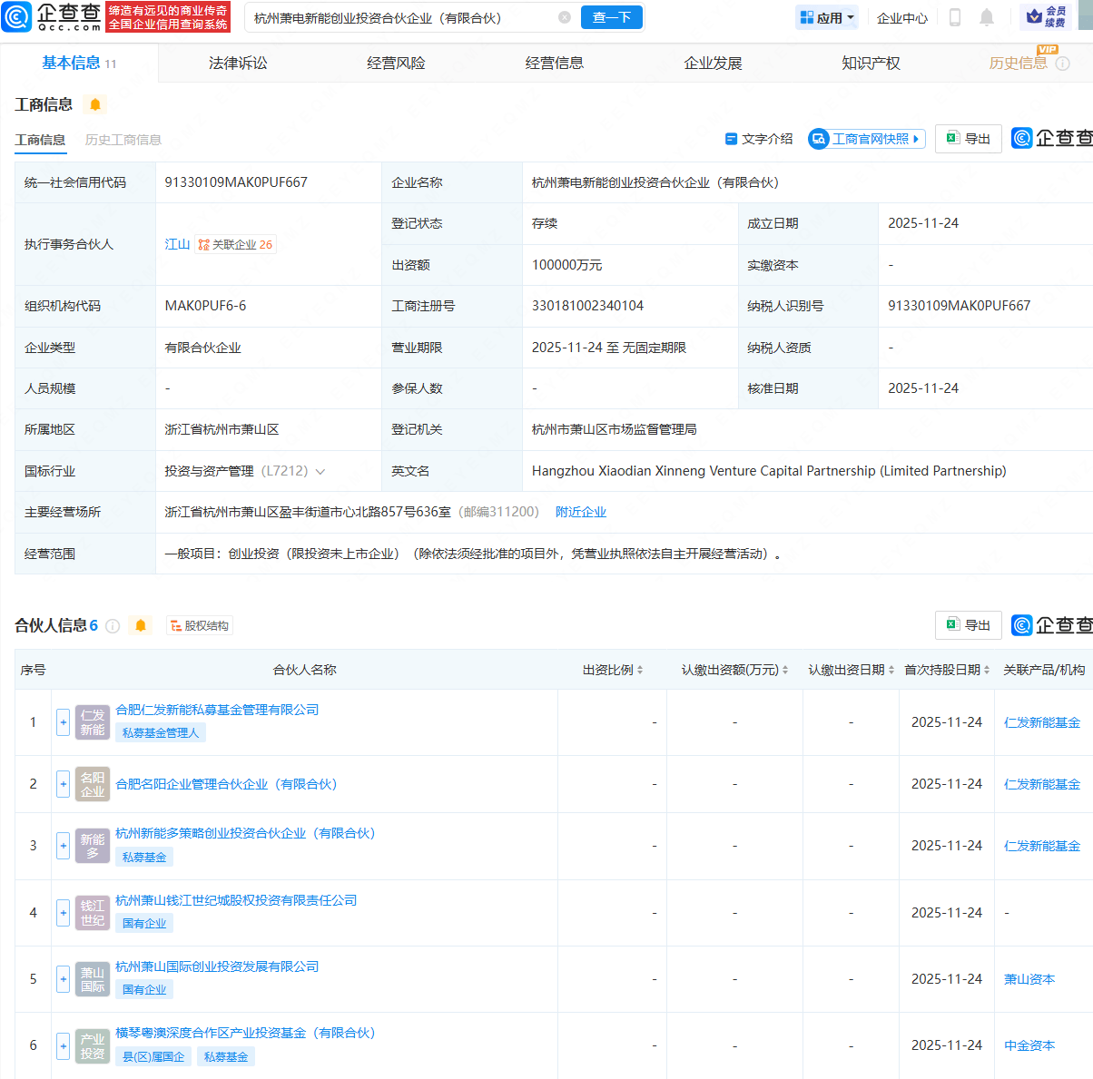 企查查APP显示,近日,杭州萧电新能创业投资合伙企业(有限合伙)成立,出资额10亿元,经营范围包含:创业投资(限投资未上市企业)。企查查股权穿透显示,该合伙企业由阳光电源(300274)旗下杭州新能多策略创业投资合伙企业(有限合伙)、杭州萧山国际创业投资发展有限公司等共同持股。