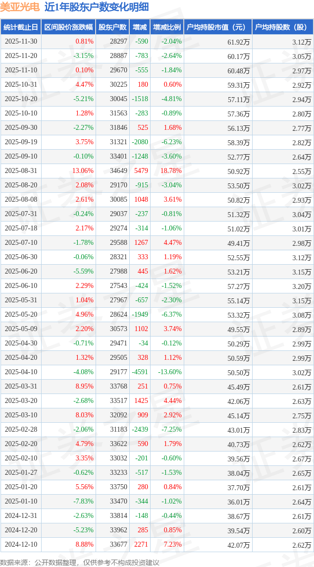 从股价来看,2025年11月20日至2025年11月30日,美亚光电区间涨幅为0.81%,在此期间股东户数减少590.0户,减幅为2.04%。
