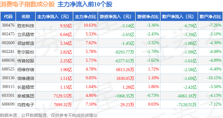 资金流向方面,消费电子(980030)指数成份股当日主力资金净流入合计5.2亿元,游资资金净流出合计2.48亿元,散户资金净流出合计2.71亿元。成份股资金流向详情见下表: