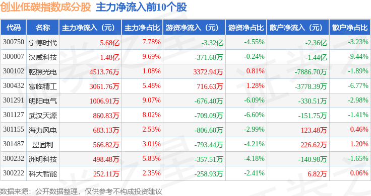 资金流向方面,创业低碳(399259)指数成份股当日主力资金净流出合计8.91亿元,游资资金净流出合计2.85亿元,散户资金净流入合计11.76亿元。成份股资金流向详情见下表: