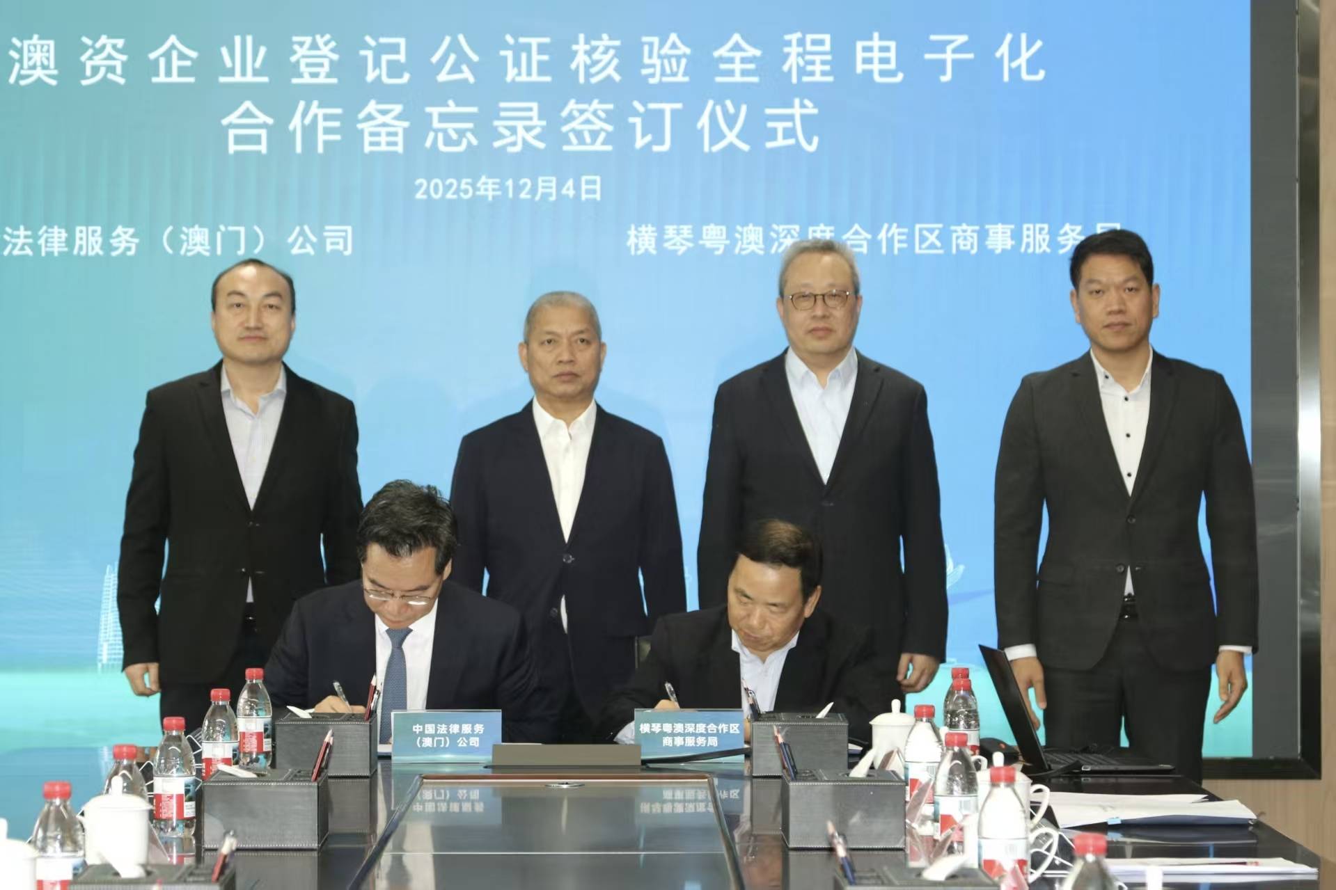 12月4日,横琴粤澳深度合作区商事服务局与中国法律服务(澳门)公司签署《合作备忘录》,共同推动实施合作区澳资企业登记公证核验全程电子化服务。此举标志着澳门投资者办理合作区商事登记业务的便利化程度再获实质性提升。