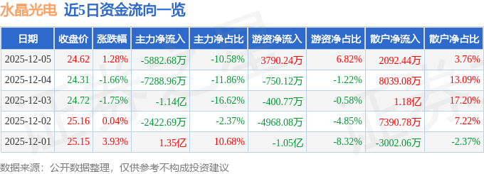 证券之星消息,截至2025年12月5日收盘,水晶光电(002273)报收于24.62元,上涨1.28%,换手率1.66%,成交量22.67万手,成交额5.56亿元。