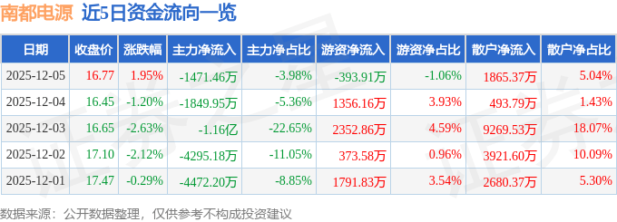 证券之星消息,截至2025年12月5日收盘,南都电源(300068)报收于16.77元,上涨1.95%,换手率2.61%,成交量22.29万手,成交额3.7亿元。
