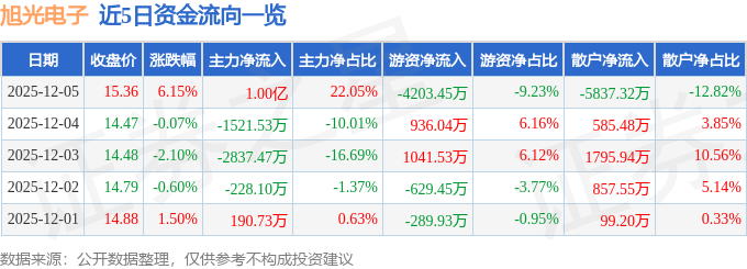 证券之星消息,截至2025年12月5日收盘,旭光电子(600353)报收于15.36元,上涨6.15%,换手率3.66%,成交量30.36万手,成交额4.55亿元。