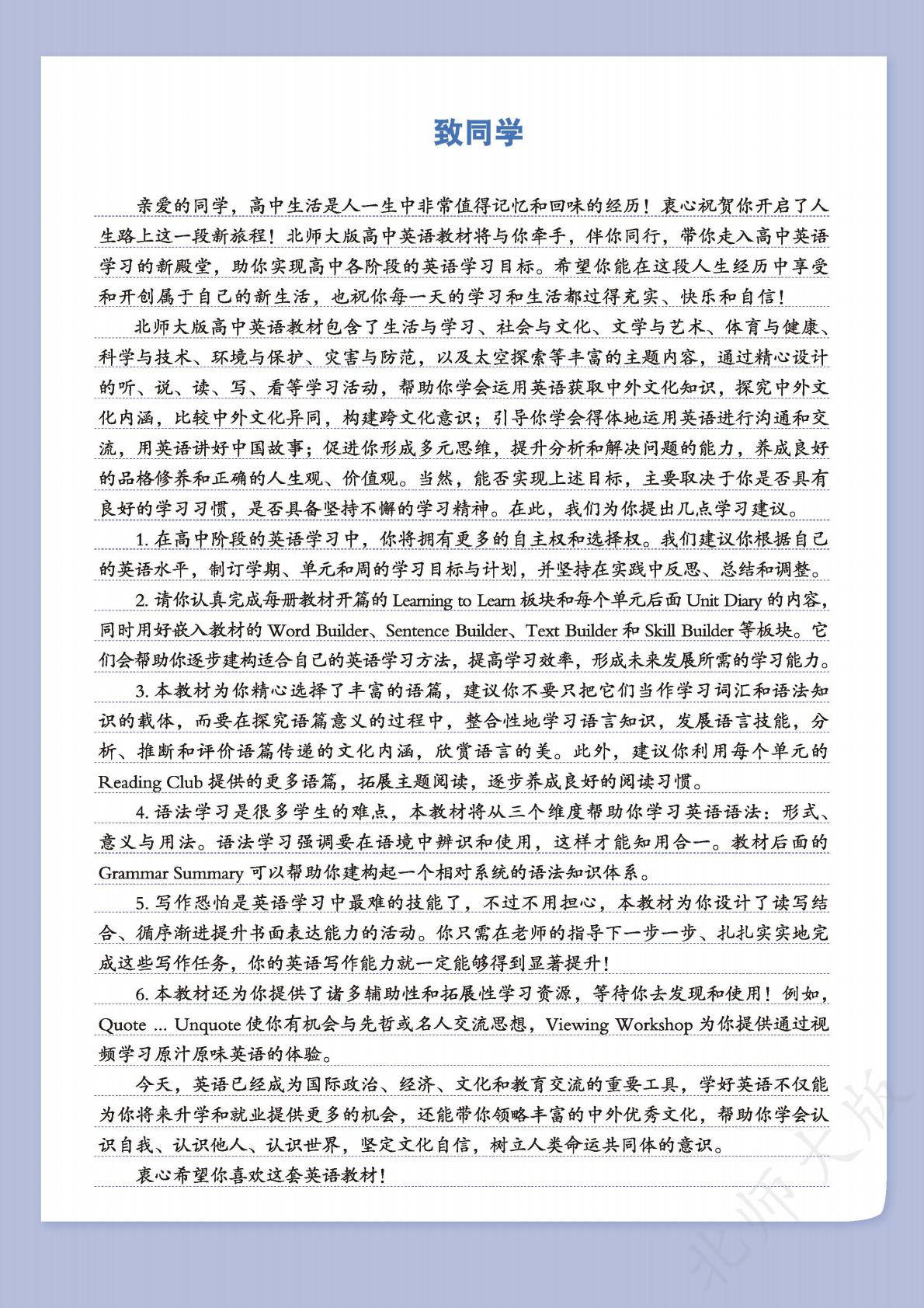 为了帮助高中生自主预习与有效复习,我们整理了2026新教材北师大版高中英语必修一电子课本,教材突出跨学科思维与实际应用能力的培养,下面以图片的形式呈现给大家,希望可以帮助到大家。