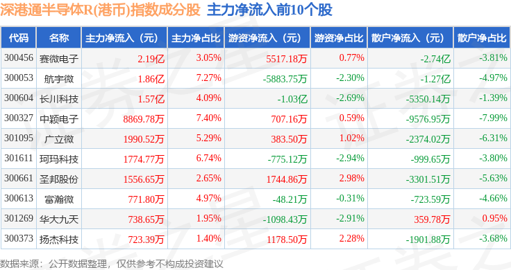 资金流向方面,深港通半导体R(港币)(483068)指数成份股当日主力资金净流出合计1.75亿元,游资资金净流出合计8519.0万元,散户资金净流入合计2.6亿元。成份股资金流向详情见下表: