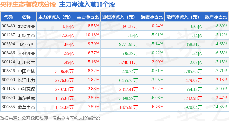资金流向方面,央视生态(399556)指数成份股当日主力资金净流出合计20.4亿元,游资资金净流入合计4.35亿元,散户资金净流入合计16.05亿元。成份股资金流向详情见下表: