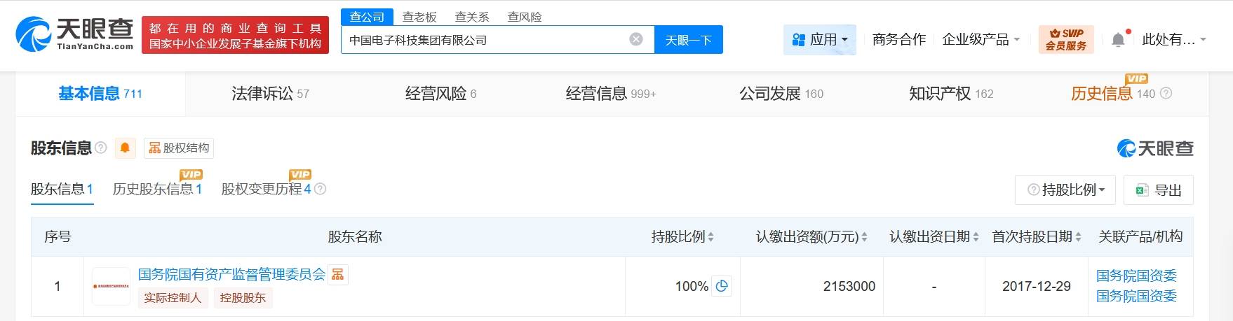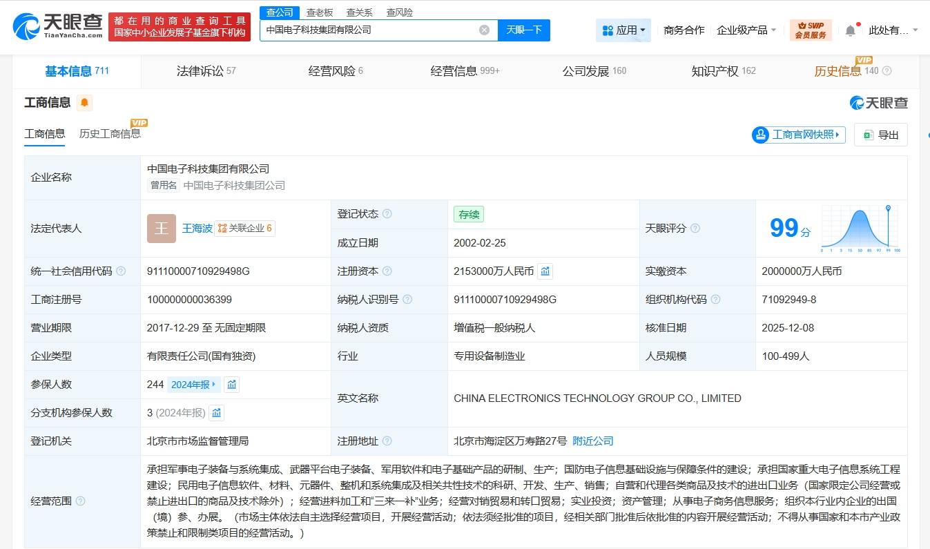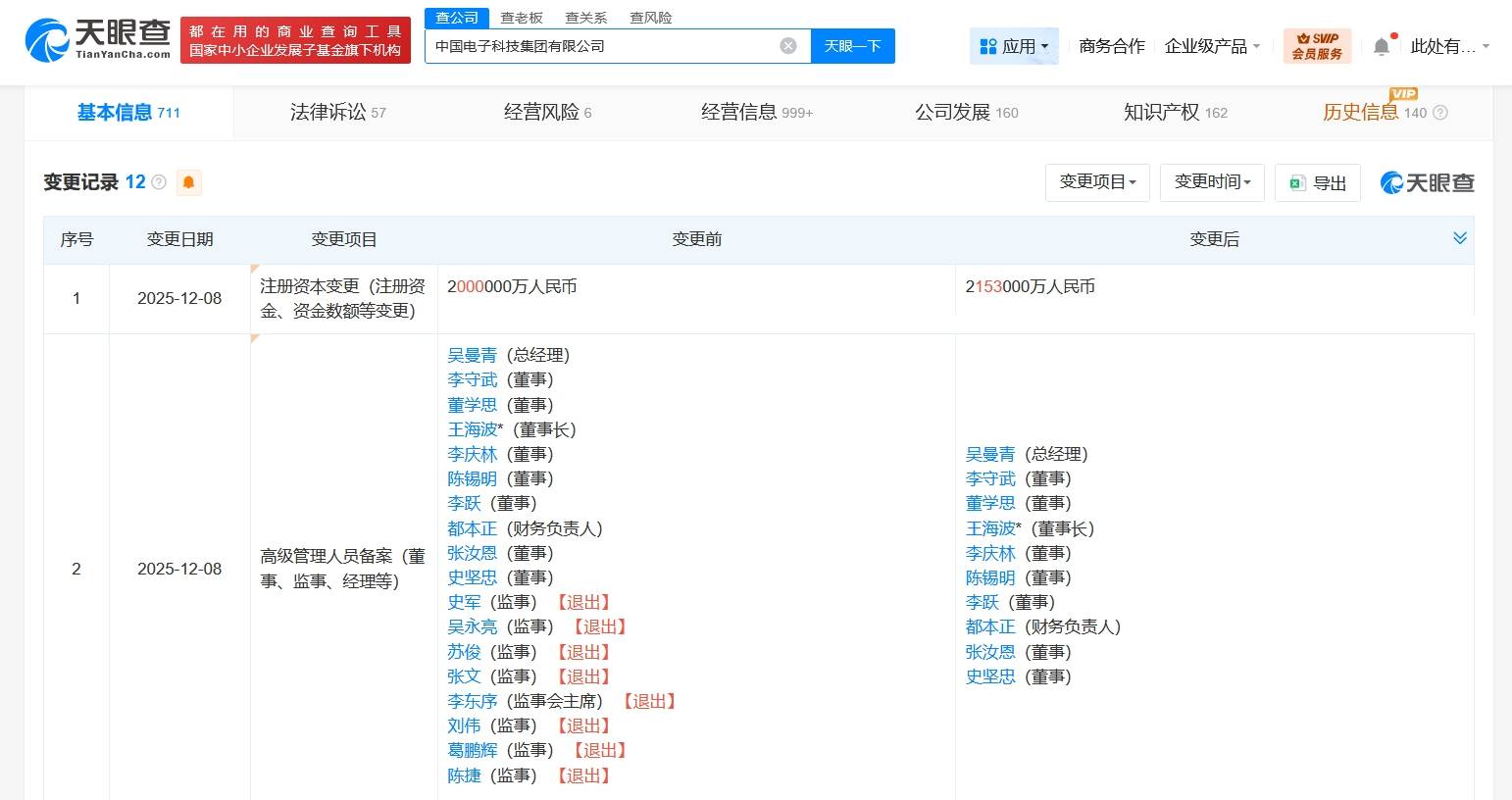 每经AI快讯,天眼查App显示,近日,中国电子科技集团有限公司发生工商变更,注册资本由200亿元人民币增至215.3亿元,增幅约7.7%,同时,多位主要人员发生变更。该公司成立于2002年2月,法定代表人为王海波,经营范围含承担国家重大电子信息系统工程建设,民用电子信息软件、材料、元器件、整机和系统集成及相关共性技术的科研、开发、生产、销售等。股东信息显示,该公司由国务院国有资产监督管理委员会全资持股。
