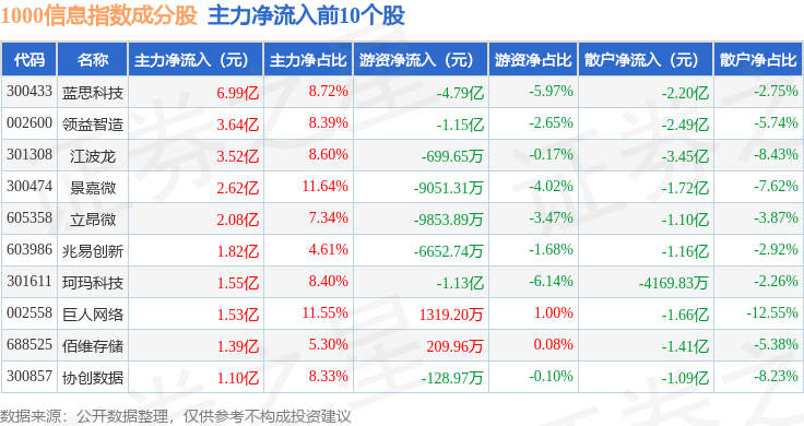 资金流向方面,1000信息(399388)指数成份股当日主力资金净流出合计145.47亿元,游资资金净流入合计46.68亿元,散户资金净流入合计98.79亿元。成份股资金流向详情见下表: