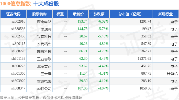 证券之星消息,12月11日,1000信息(399388)指数报收于6198.47点,跌1.79%,成交2328.72亿元,换手率1.87%。当日该指数成份股中,上涨的有24家,珂玛科技以10.44%的涨幅领涨,下跌的有156家,深南电路以6.02%的跌幅领跌。