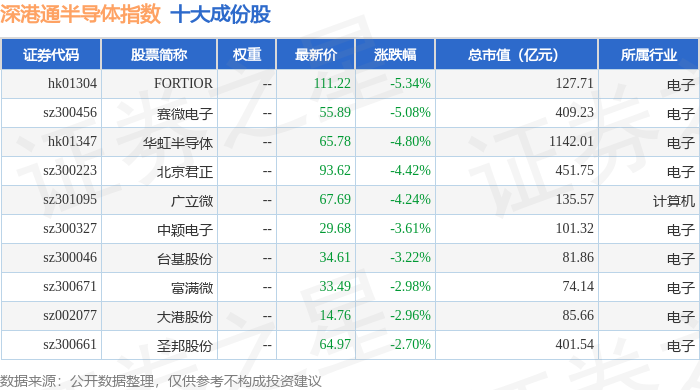 证券之星消息,12月11日,深港通半导体(983067)指数报收于13850.62点,跌2.14%,成交401.38亿元,换手率3.1%。当日该指数成份股中,上涨的有4家,珂玛科技以10.44%的涨幅领涨,下跌的有35家,FORTIOR以5.34%的跌幅领跌。