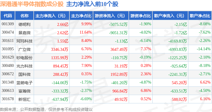 资金流向方面,深港通半导体(983067)指数成份股当日主力资金净流出合计14.95亿元,游资资金净流入合计3.77亿元,散户资金净流入合计11.18亿元。成份股资金流向详情见下表: