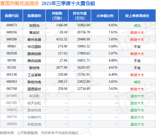 根据2025基金Q3季报公募基金重仓股数据,重仓该股的公募基金共16家,其中持有数量最多的公募基金为富国基金的富国均衡优选混合。富国均衡优选混合目前规模为35.12亿元,最新净值1.2347(12月11日),较上一交易日下跌2.21%,近一年上涨51.4%。该公募基金现任基金经理为杨栋。杨栋在任的基金产品包括:富国低碳新经济混合A,管理时间为2015年12月18日至今,期间收益率为322.57%;富国积极成长一年定开混合,管理时间为2020年6月15日至今,期间收益率为83.99%;富国成长领航混合,管理时间为2021年1月25日至今,期间收益率为25.13%。