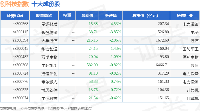 创科技(399276)指数十大成份股详情如下: