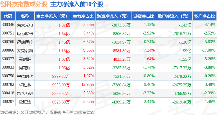 资金流向方面,创科技(399276)指数成份股当日主力资金净流出合计46.52亿元,游资资金净流入合计18.94亿元,散户资金净流入合计27.59亿元。成份股资金流向详情见下表: