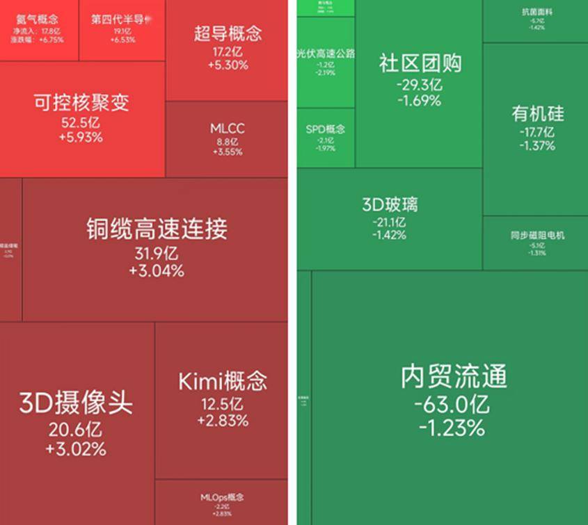 12月12日,A股三大指集体上涨,截至收盘,沪指涨0.41%报3889.35点,深成指涨0.84%报13258.33点,创业板指涨0.97%报3194.36点。从板块行情上来看,今日表现较好的是第四代半导体、可控核聚变和铜缆高速连接,而社区团购、有机硅和内贸流通等板块下跌。
