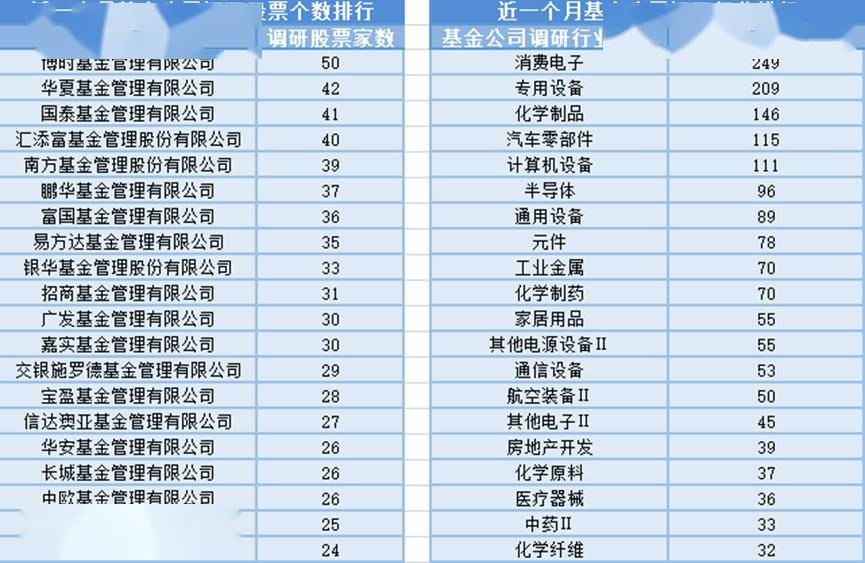近一个月(11月12日-12月12日),博时基金参与公司调研的数量最多,共调研50家上市公司,此外调研较为活跃的还有华夏基金、国泰基金和汇添富基金,分别调研42家、41家、40家上市公司;从调研行业上来看,基金公司对消费电子行业的上市公司调研次数最多,共有249次,其次是专用设备行业,基金公司调研了209次。
