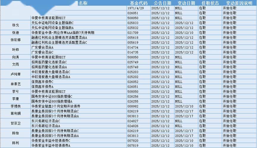 基金经理是一只基金产品最核心的成员,能决定一只基金的投资方向、投资策略以及投资风格,基金经理出色的择时选股能力和调研预测能力是基金业绩的有力保证,所以基金经理是投资者在选择基金产品时的重要依据。基金经理的变动很大程度上会影响到基金产品未来的表现,是一个需要特别关注的信息。12月12日共有19位基金经理发生任职变动。