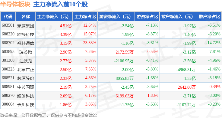从资金流向上来看,当日半导体板块主力资金净流出11.34亿元,游资资金净流入3.36亿元,散户资金净流入7.98亿元。半导体板块个股资金流向见下表: