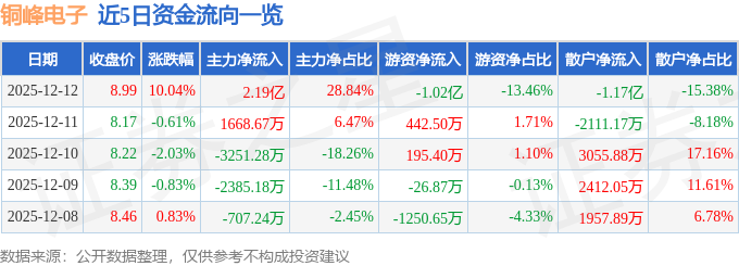 证券之星消息,截至2025年12月12日收盘,铜峰电子(600237)报收于8.99元,上涨10.04%,涨停,换手率14.24%,成交量88.55万手,成交额7.61亿元。