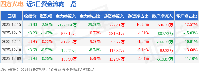证券之星消息,截至2025年12月15日收盘,四方光电(688665)报收于46.8元,下跌2.96%,换手率0.91%,成交量9188.0手,成交额4346.62万元。