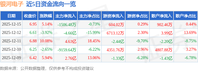 证券之星消息,截至2025年12月15日收盘,银河电子(002519)报收于6.95元,上涨5.14%,换手率27.22%,成交量304.56万手,成交额20.67亿元。