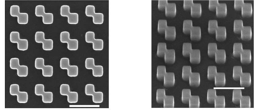 他们使用纳米加工技术,在玻璃衬底上制造出了大面积、排列整齐的单晶硅纳米结构阵列,形成了所谓的手性超表面。