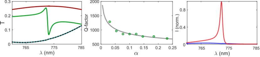 当在这个结构上雕刻出不对称的图案,比如把一个方形的纳米柱子的一角切掉,就打破了结构的空间对称性。这个被囚禁的光态,现在有了一个微小的泄漏口,可以与外界自由空间的光发生相互作用,形成一个尖锐的光学共振峰,这个共振峰所处的模式为准束缚态(quasi-BIC,q-BIC)。