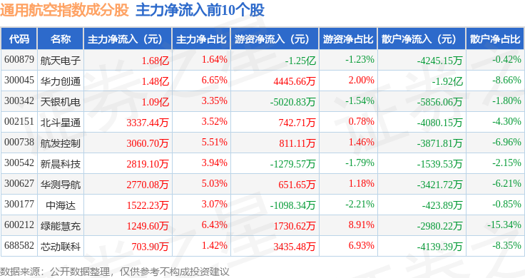 资金流向方面,通用航空(980076)指数成份股当日主力资金净流出合计11.3亿元,游资资金净流入合计2.54亿元,散户资金净流入合计8.76亿元。成份股资金流向详情见下表: