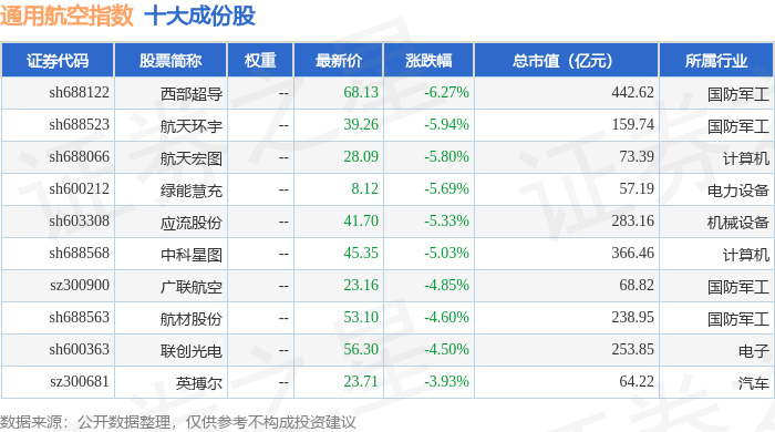 通用航空(980076)指数十大成份股详情如下: