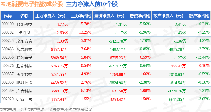 资金流向方面,内地消费电子(983105)指数成份股当日主力资金净流出合计12.44亿元,游资资金净流出合计1.84亿元,散户资金净流入合计14.28亿元。成份股资金流向详情见下表: