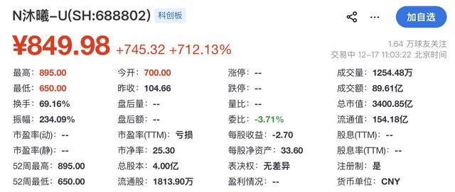 当全球AI竞赛进入算力决胜局,一家中国芯片公司正试图打破国际巨头的垄断。12月17日,沐曦股份正式在科创板挂牌上市,携其全栈自研的“中国芯”叩开资本市场的大门。上市当天股价一路飙升,开盘价700元,12月17日上午股价最高触及895元,相较发行价104.66元最高涨幅达755%。