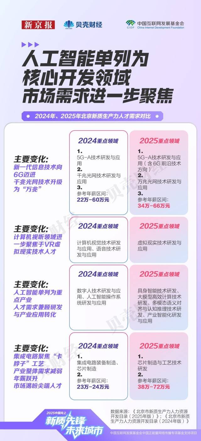 新京报贝壳财经记者发现,与2024年相比,今年《目录》核心开发领域从60个精简至58个,人工智能从新一代信息技术中独立成列;同时,“专家”一词出现频次由28次增至31次,参考年薪区间整体上移。这些变化释放出明确信号——北京的人才需求正进一步向尖端人才聚焦。