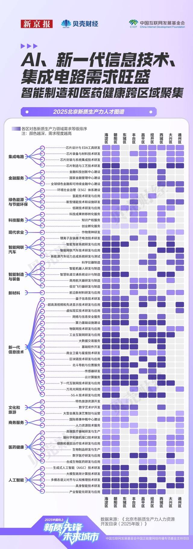 新京报贝壳财经记者梳理《目录》发现,海淀与朝阳在人才重点需求区域中出现频率最高,分别覆盖了58个新质生产力核心领域中的57个,既涉及具身智能、脑机接口、智能驾驶、6G研发等前沿技术,也延伸至知识产权、商事仲裁等配套服务,产业链条完整。
