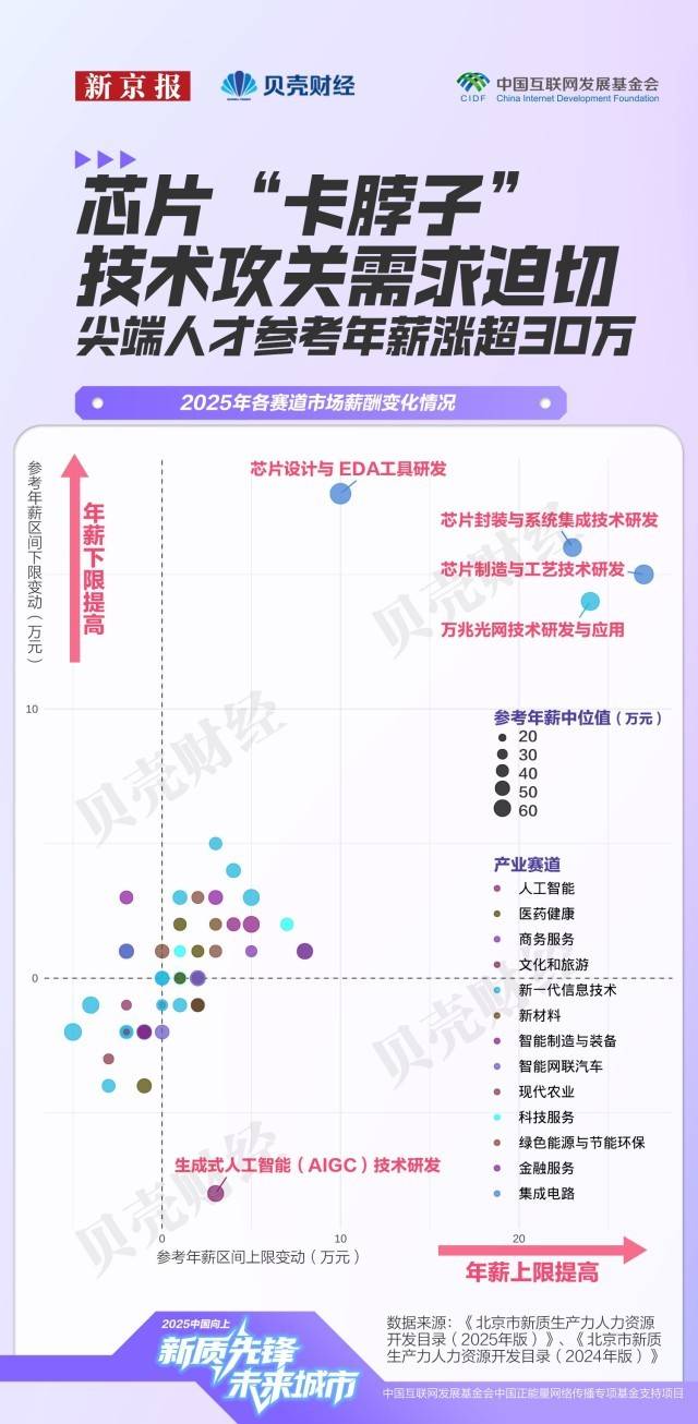 这种趋势并非集成电路产业独有。新京报贝壳财经记者基于《目录》统计发现,在与2024年具有可比数据的52个核心领域中,30个领域的参考年薪上限提高,占比近六成,其中20个领域薪酬区间整体上移。