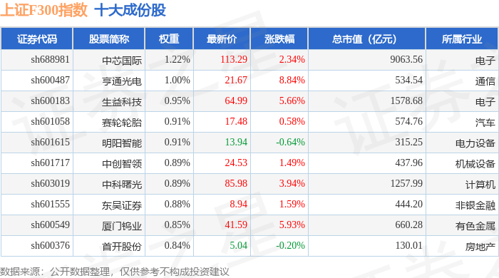 证券之星消息,12月17日,上证F300(000099)指数报收于8864.38点,涨1.27%,成交1620.41亿元,换手率1.55%。当日该指数成份股中,上涨的有213家,亨通光电以8.84%的涨幅领涨,下跌的有65家,莱克电气以6.01%的跌幅领跌。