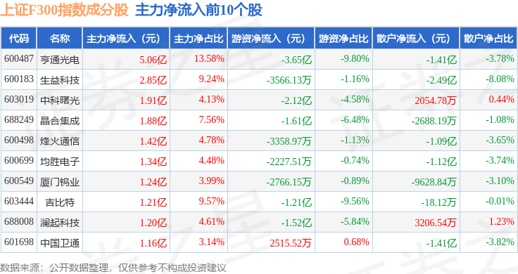 资金流向方面,上证F300(000099)指数成份股当日主力资金净流出合计38.04亿元,游资资金净流出合计5.87亿元,散户资金净流入合计43.91亿元。成份股资金流向详情见下表: