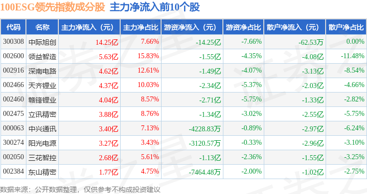资金流向方面,100ESG领先(970030)指数成份股当日主力资金净流入合计40.18亿元,游资资金净流出合计27.46亿元,散户资金净流出合计12.72亿元。成份股资金流向详情见下表: