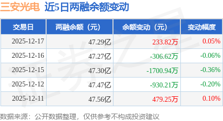 证券之星消息,12月17日,三安光电(600703)融资买入5630.29万元,融资偿还5415.0万元,融资净买入215.28万元,融资余额47.27亿元。