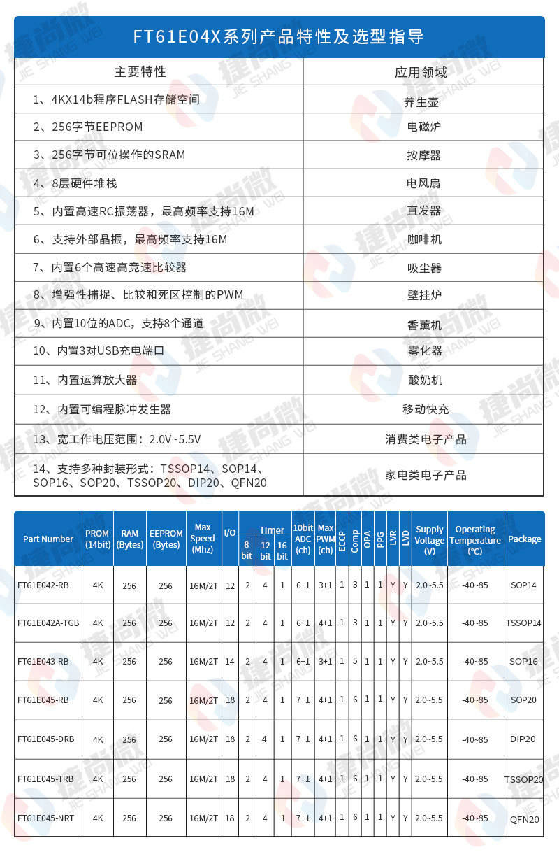 同时,低功耗设计与灵活 I/O 配置的组合,让 FT61E04X 的适配性大幅提升。其低功耗特性不仅体现在指令周期的智能调节上,更通过优化的电源管理模块,在休眠模式下能将功耗控制在极低水平,完美适配便携式传感器、无线监测设备等依赖电池供电的产品。