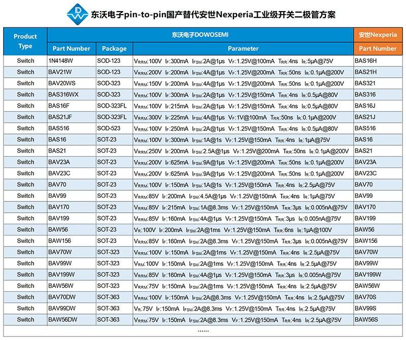 1)全面覆盖,一站式替代:东沃电子提供从SOD-123、SOD-323到SOT-23、SOT-363等多种封装的完整型号对照,无需四处寻觅,东沃是您的一站式解决方案。
