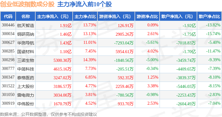 资金流向方面,创业低波(399692)指数成份股当日主力资金净流出合计23.18亿元,游资资金净流入合计9.03亿元,散户资金净流入合计14.15亿元。成份股资金流向详情见下表:
